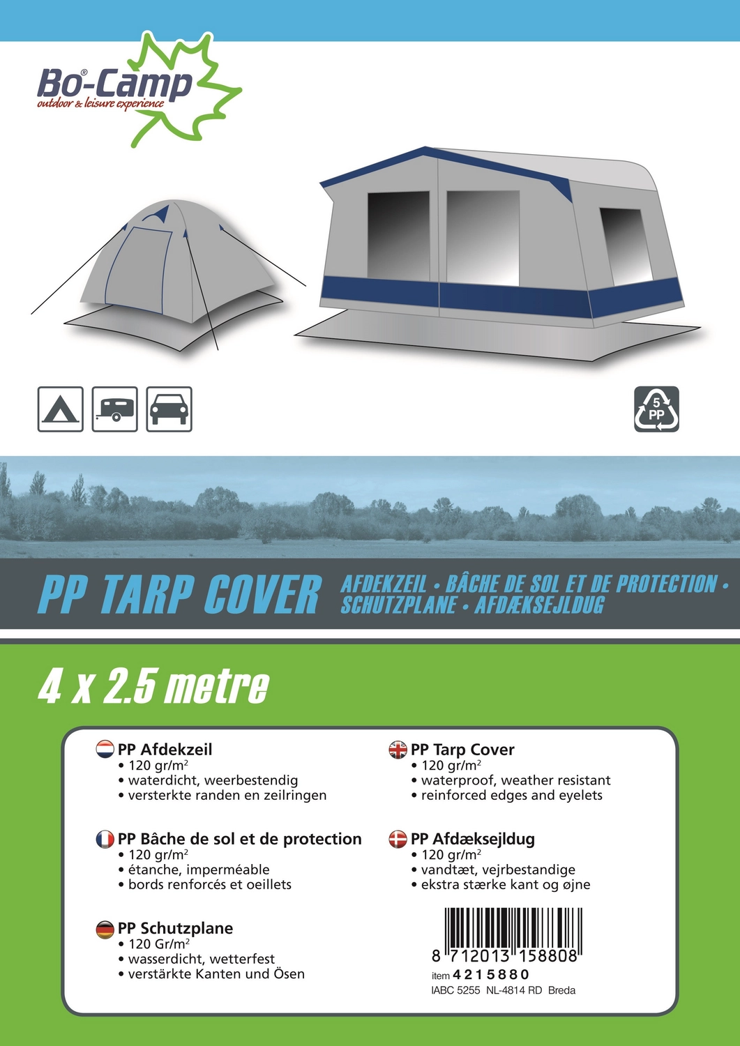 Een stevig afdekzeil van Bo-Cam, wie bekend staat om haar goede kwaliteit. Dit zeil van 4 bij 250 meter is voorzien van gelaste naden, versterkte randen en stevige zeilogen. Het is erg nuttig om je kampeerspullen uit het natte gras te houden en verzekerd te zijn van een droge ondergrond voor je tent. Het zeil is waterdicht, weersbestendig en van hoge kwaliteit (120 gr/m²).