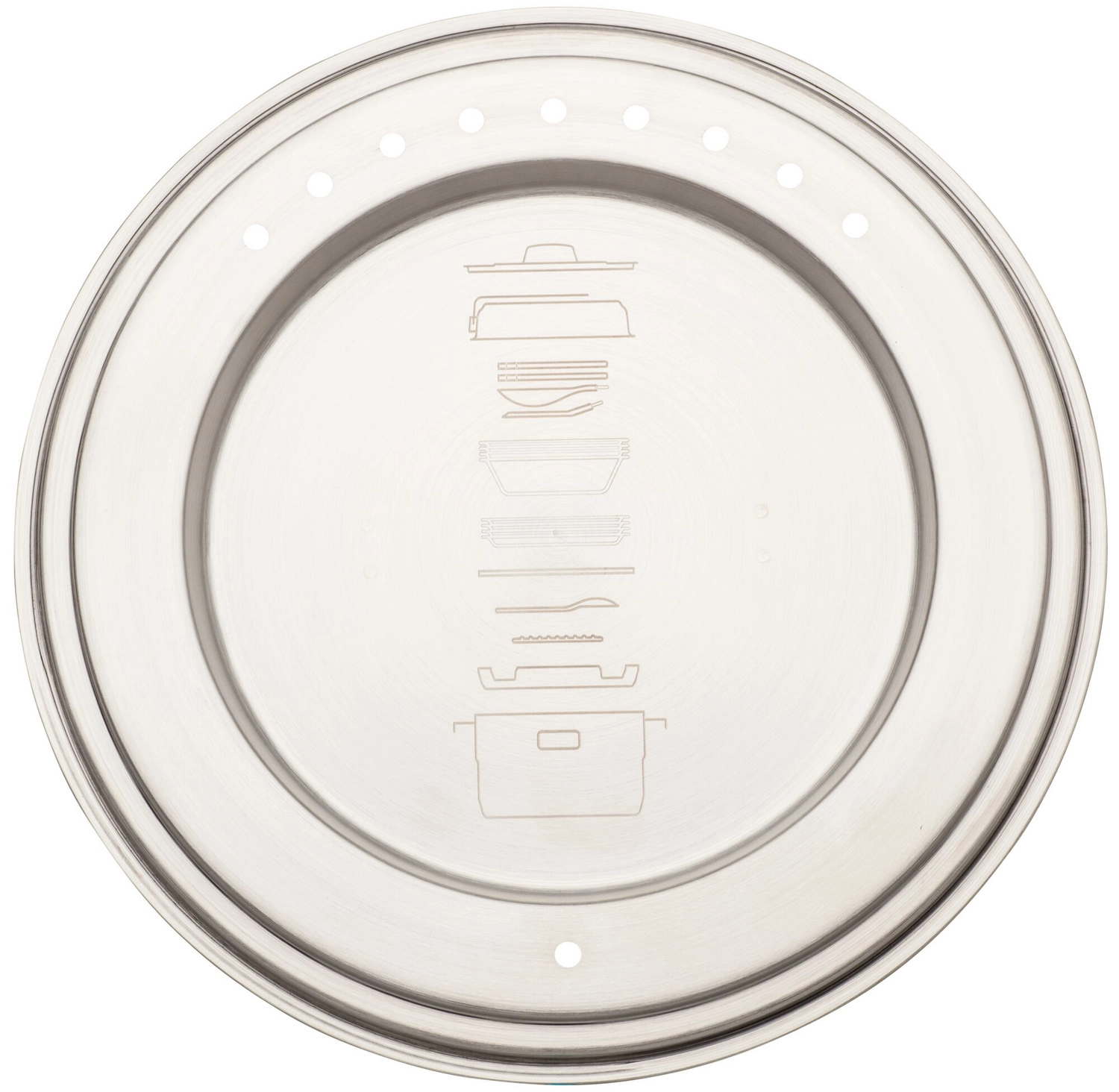 - RVS pot 3,5 l, ventilerend deksel, 3-laags braadpan 0,94 l, snijplank, spatel en serveerlepel met uitschuifbaar handvat, 4 borden, 4 kommen, 4 sporken, afdruiprek, onderzetter en vergrendelbare bungee