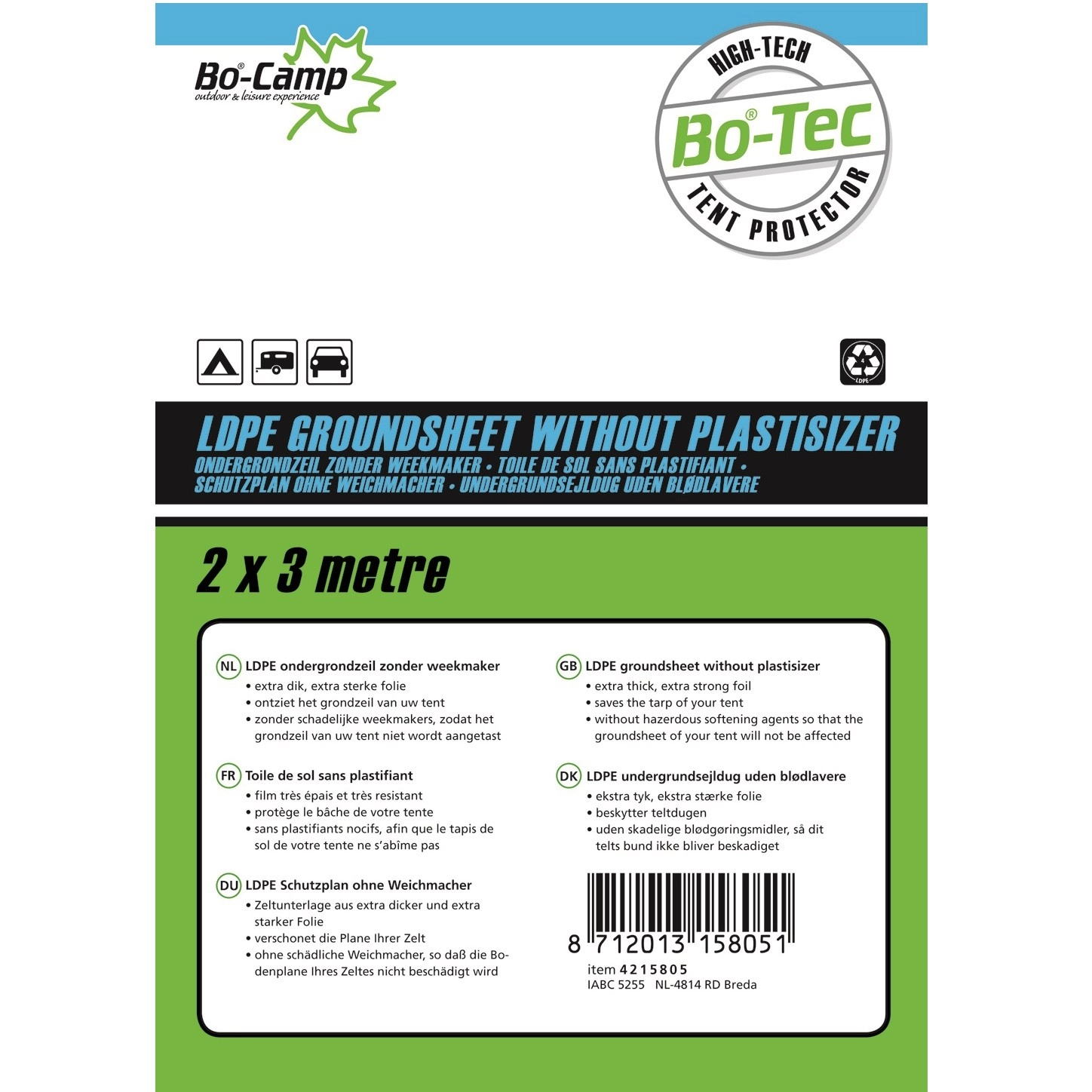 Extra sterk ondergrondzeil. Zorgt dat het grondzeil van de tent niet vies wordt en dat optrekkend vocht wordt tegengehouden, zodat alle kampeerspullen droog blijven. Ook handig om iets mee af te dekken tegen de regen. Bevat geen weekmakers zodat de coating van het grondzeil niet wordt aangetast. Gemaakt van 0,03 millimeter ‘low density polyethyleen’ (LDPE).