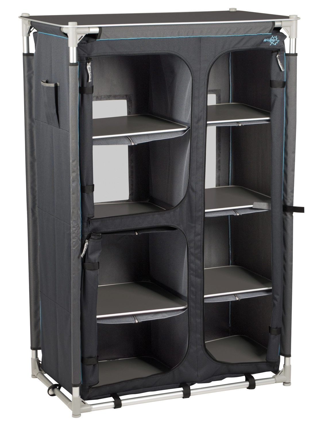 Deze luxe hangkast is van het merk Bo-Camp en is de ideale kast voor in uw tent of caravan. De compacte kast met een afmeting van 140 x 51 x 92 cm is voorzien van 8 stevige legplanken. De kast is ook te gebruiken met 4 legplanken en een roede aan de rechterkant waardoor u een hanggedeelte creëert. De kast is voorzien van afzonderlijk verstelbare poten waardoor de kast op elke ondergrond stabiel kan staan. De kast is verder voorzien van een luxe 2-tone polyester hoes en een oplegblad. De kast is inklapbaar en heeft dan een afmeting van 94 x 53,5 x 15 cm, de kast wordt geleverd is een handige draagtas.