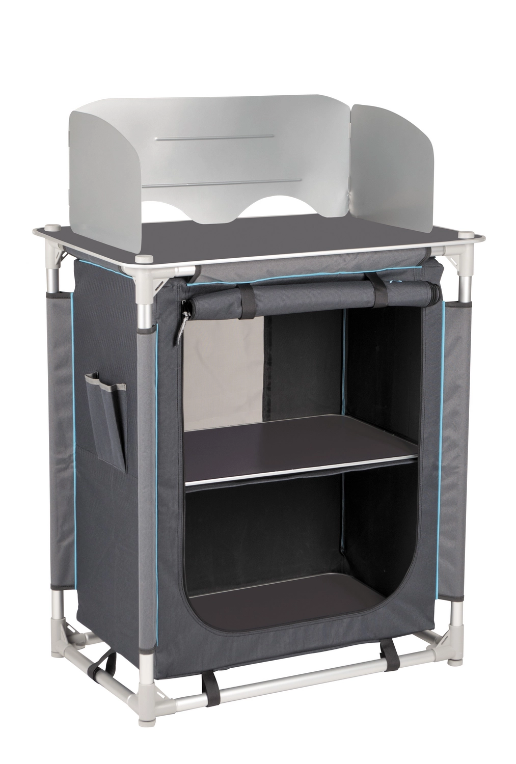 Een zeer luxe kookeiland van het merk Bo-Camp. Dit kookeiland is voorzien van een extra stevige 600 denier polyester hoes met daarin 2 handige legplanken. Het oplegblad van dit kookeiland is watervast, hittebestendig en voorzien van een windscherm. Het kookeiland is geschikt voor een 4-pits gaskomfoor. Bovendien zorgen de afzonderlijk verstelbare poten ervoor dat de legkast op iedere ondergrond stabiel staat. Hij wordt geleverd in een draagtas.