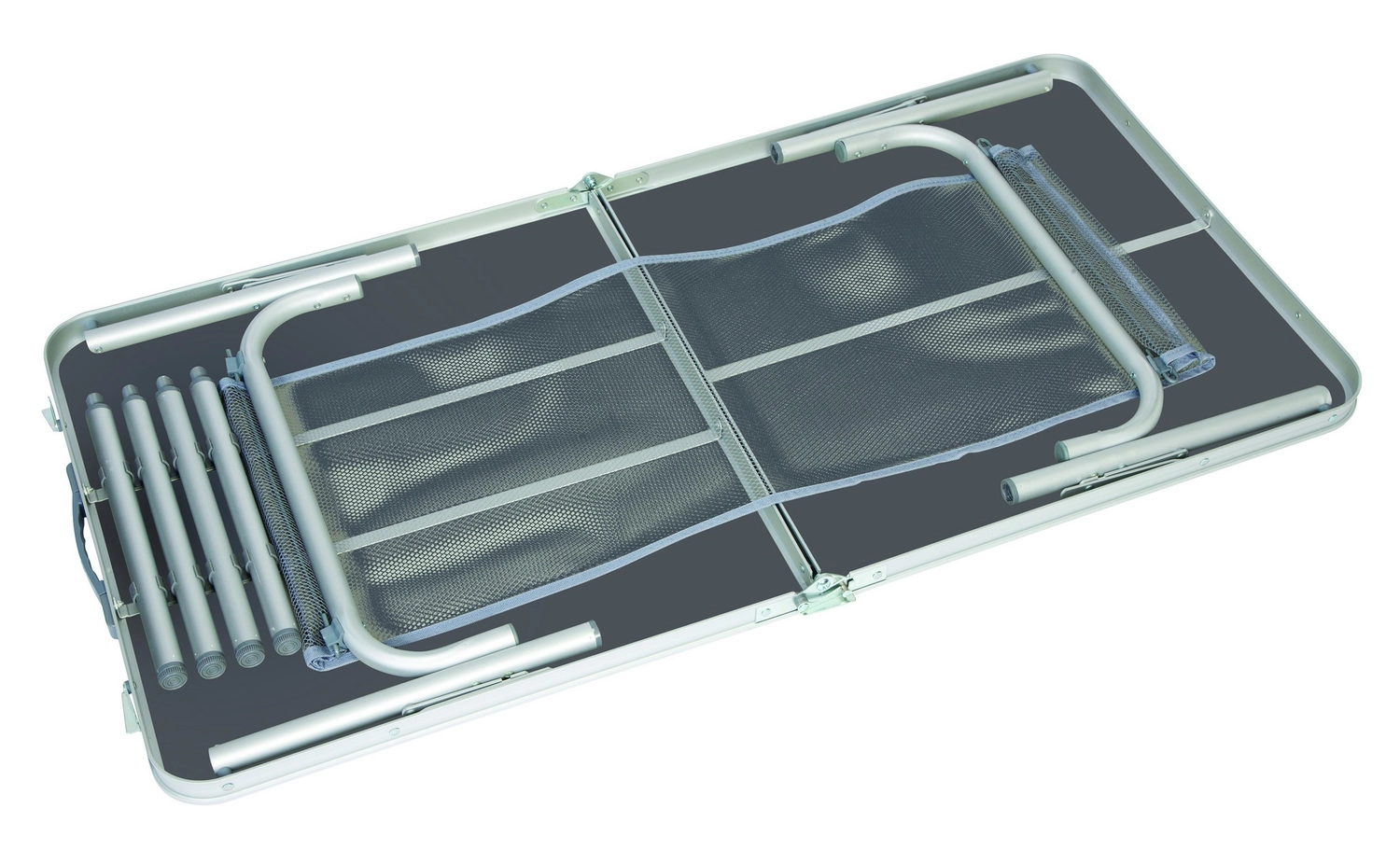 De Bo-Camp tafel is een handige en zeer stabiele tafel die voor veel verschillende doeleinden te gebruiken is. De tafelpoten zijn verstelbaar (36 cm / 70 cm) zodat u een tafel heeft voor elke situatie. De tafelpoten hebben stelschroeven voor de fijnstelling. De tafel heeft een deelbaar tafelblad, hierdoor is de tafel eenvoudig op te vouwen tot koffermodel. Deze tafel is gemaakt van aluminium en daardoor zonder enig probleem mee te nemen, daarna is hij weer binnen enkele seconden terug in elkaar te zetten. Onder het tafelblad is een net bevestigd waar spullen opgeruimd kunnen worden.