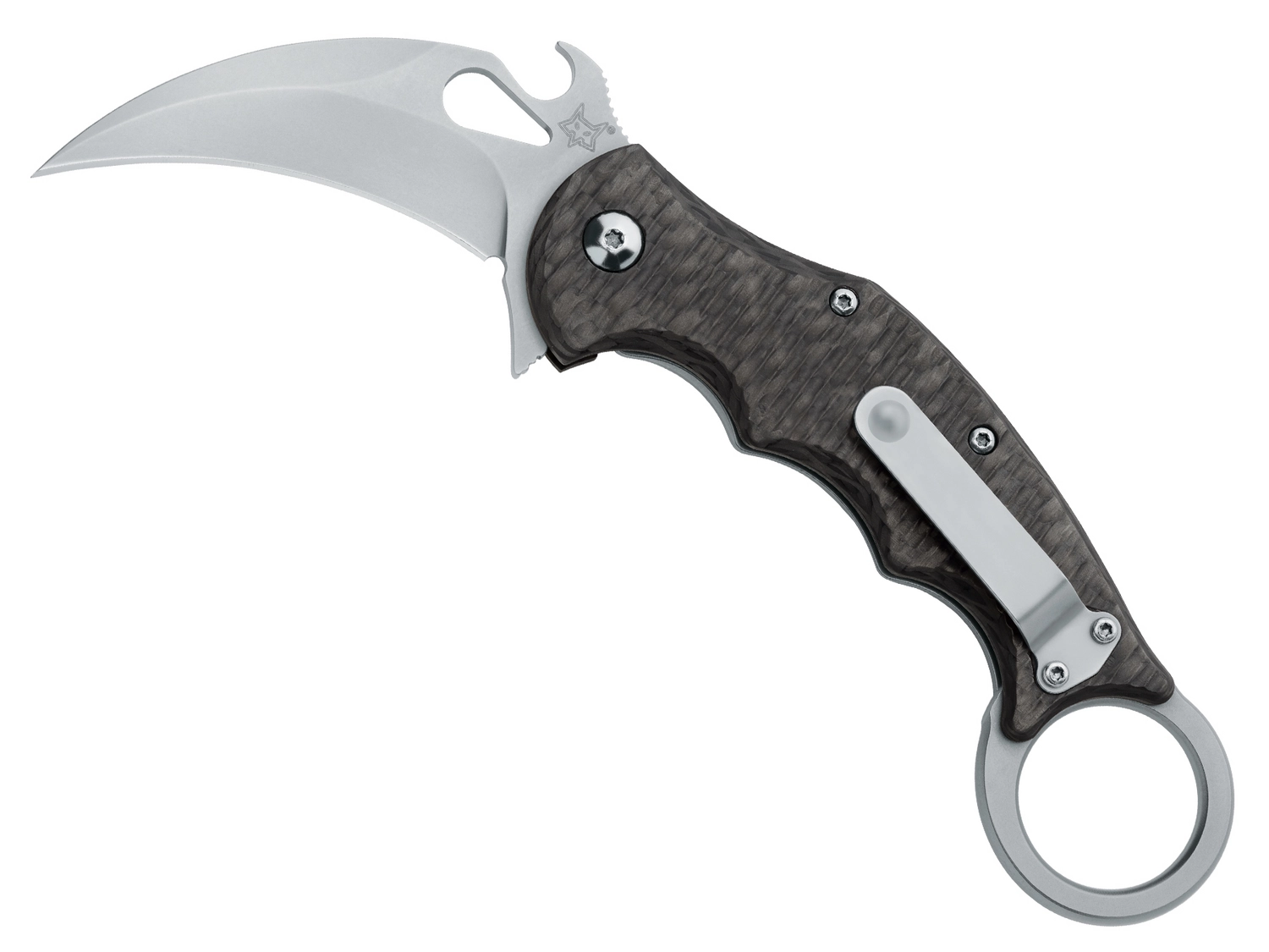 Het vouwmes Fox Knives FKMD Karambit Bead Blasted heeft een FKMD Karambit Titanium framelock, cnc machined Carbon Fiber handgreep. Tactisch model Emmerson patent met titanium clip met een keramische kogel. Zeer degelijk en fraai afgewerkte karambit, geleverd in een etui met rits. De hardheid van het mes is 58 (Rc) en de lengte van het complete mes is 19 cm.
