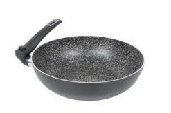 Een aluminium wokpan met hoge opstaande rand van het merk Bo-Camp. Deze lichtgewicht pan is voorzien van een 5 laagse ‘Salus Stone’ coating en een anti-slip onderkant. Door de wegklapbare handgreep is de pan ruimtebesparend en makkelijk mee te nemen. Vaatwasmachine bestendig en geschikt voor de warmtebronnen gas, keramisch en elektrisch. Dikte: 2,5 millimeter.